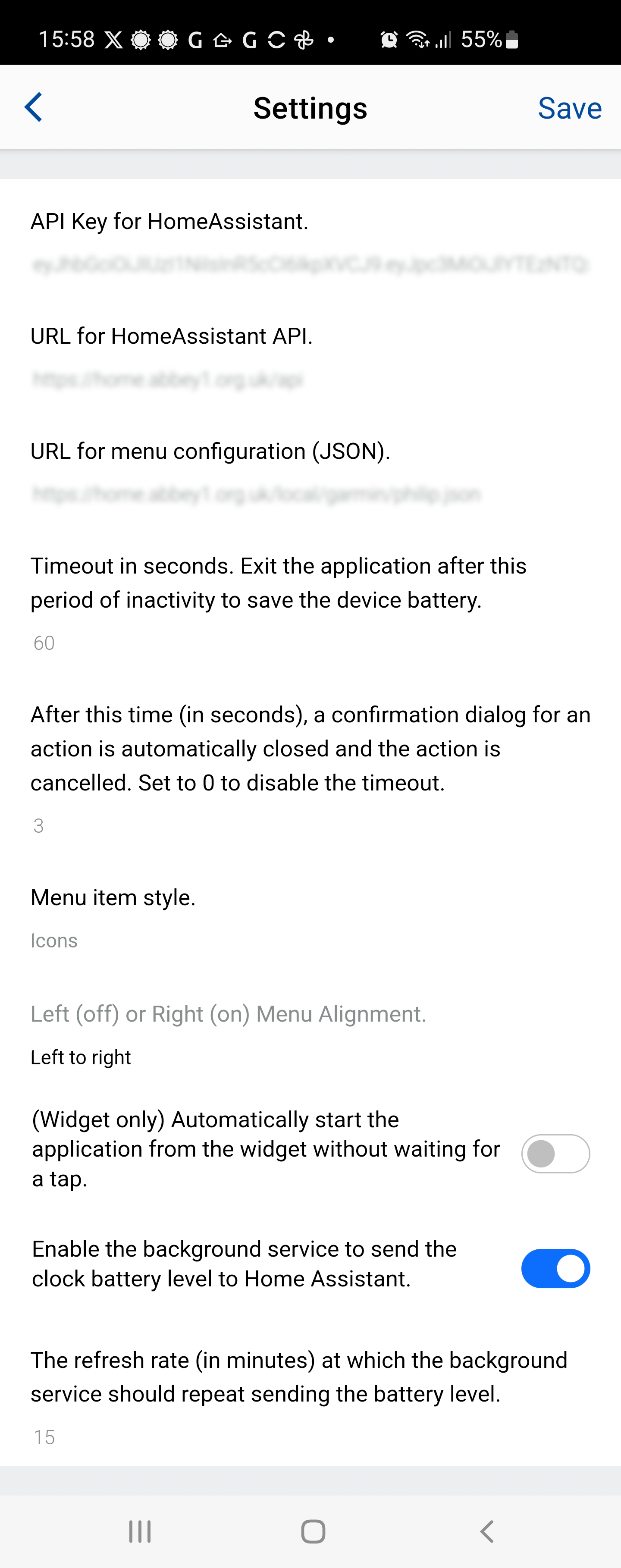 Added an optional confirmation dialogue view to prevent accidental execution of actions on mistaken tap. This also brings a change in the JSON schema to allow an optional field to specify that the confirmation should be used for a menu item. As we are now maturing and adding features we have decided to mitigate breaking changes to the JSON schema by being more careful to adopt the Home Assistant schema (noting there is a 1:1 mapping between YAML and JSON). This change does deprecate the top level `service` tag in favour of `tag_action` containing multiple fields including `service` & `confirm`. Users should migrate to the new format for the new functionality, but the timescale for actual deprecation are long and undecided. | | 1.6 | Added a user configurable 'timeout' in seconds so that when no action is taken the application automatically closes, stopping the continuous polling for changes of status and hence saving the drain on the battery. This can be disabled with timeout=0. | | 1.7 | Added timeout to confirmation views so that when used for security devices it does not linger when left unconfirmed. Thanks to [Jan Schneider](https://github.com/j-a-n) for the contribution. Known bug for devices not supporting [`WatchUi.getCurrentView()`](https://developer.garmin.com/connect-iq/api-docs/Toybox/WatchUi.html#getCurrentView-instance_function) API call which is only available on API Level 3.4.0, e.g. Vivoactive 4S. | | 2.0 | A significant code base change to enable both a 'widget' version for older devices, e.g. Venu (1), and an application with a glance, e.g. Venu2. These two versions must now be distributed under separate application IDs, but they have the same code base. A further 20 more devices are now supported, the settings have been internationalised, and there's a bug fix for older devices when trying to display a helpful error message but instead the application crashed. This version has come from a significant collaboration with [Someone0nEarth](https://github.com/Someone0nEarth). | | 2.1 | Deployment of an idea to provide Home Assistant with access to the watch battery level. Using this requires [significant setup](BatteryReporting.md) on the Home Assistant configuration and hence is detailed separately. Due to this, the default state for this battery option is _off_. Changed the application settings user interface to be more intuitive, and hence amended the way settings are managed in the background. | ## Known Issues 1. On some (old) devices (e.g. Vivoactive 3, Fexix 5s & Edge 520+), the menu does not update correctly to reflect changes in state effected by an external Home Assistant control. E.g. when the phone application changes the toggle status of a switch, the Garmin application does not reflect that change until the menu is touched or scrolled a little. This is a [known issue](https://forums.garmin.com/developer/connect-iq/i/bug-reports/menu2-doesn-t-allow-live-updates) already reported without a suggested software fix.