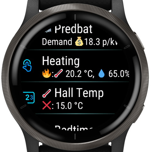 A Garmin application to provide a "dashboard" to control your devices via HomeAssistant. The application will never be as fully fledged as a HomeAssistant dashboard, so it is designed to be good enough for the simple and essential things. Those things that can be activated via an on/off toggle or a tap. That should cover lights, switches, and anything requiring a single press such as an automation. For anything more complicated, e.g. thermostat, it would always be quicker and simpler to reach for your phone or tablet... or the device's own remote control!