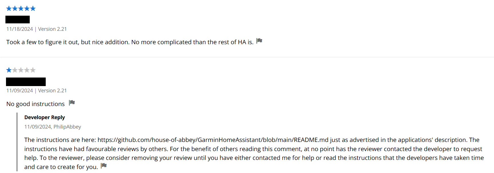 The Connect IQ user [redacted] has sent you the following request regarding your app "GarminHomeAssistant > (Application)":